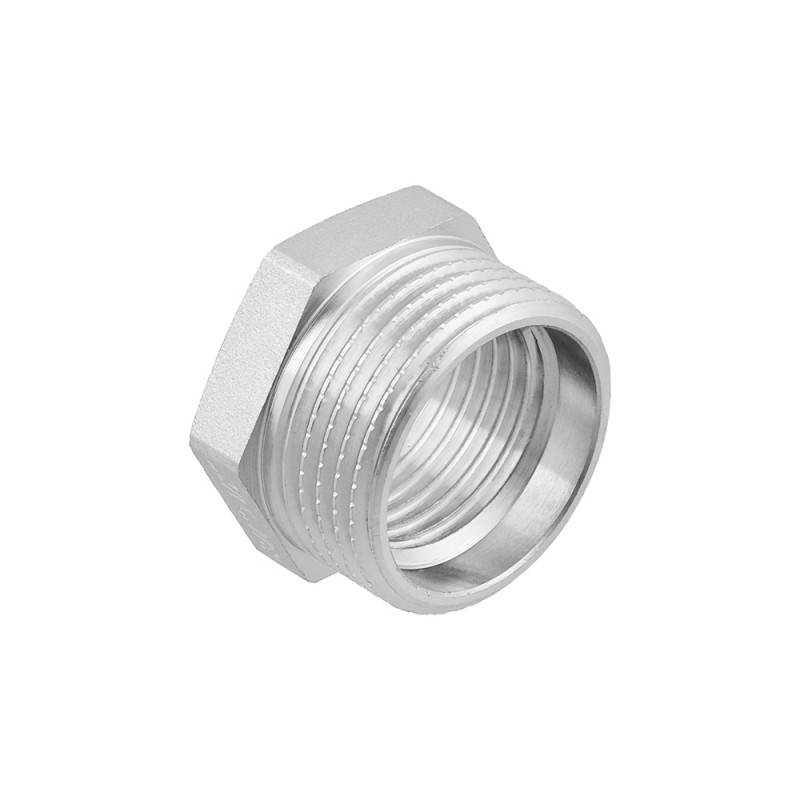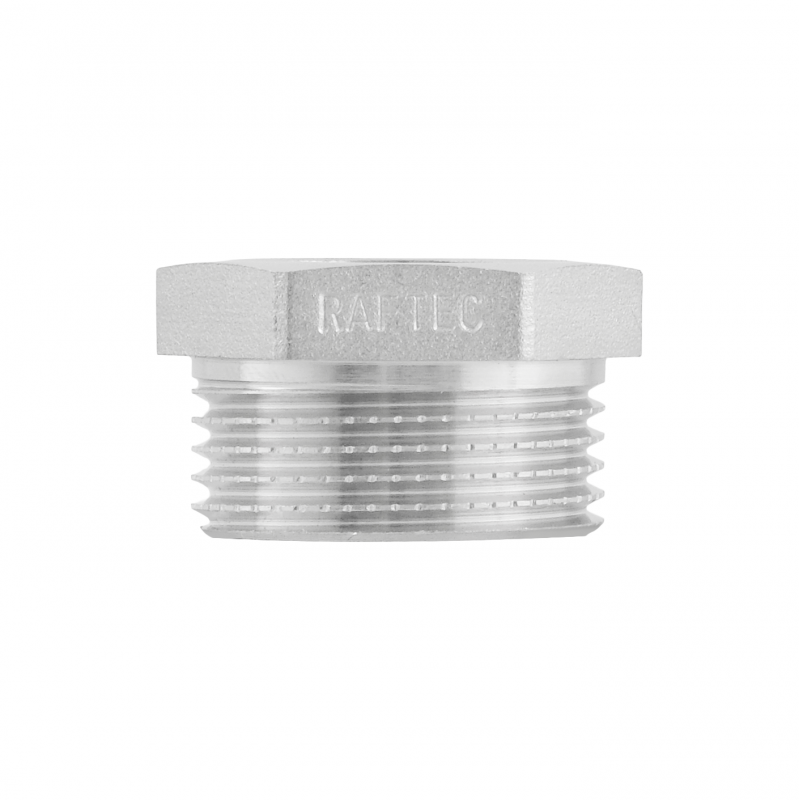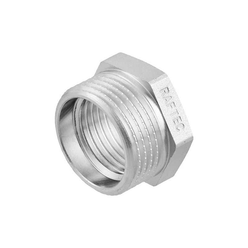 Різьбовий фітинг Raftec - латунна нікельована футорка для з'єднання елементів трубопроводу різного діаметру. Різьба внутрішня з переходом на зовнішню, циліндрична трубна ISO 228, EN 10226. Корпус шестигранної форми, під гайковий ключ.