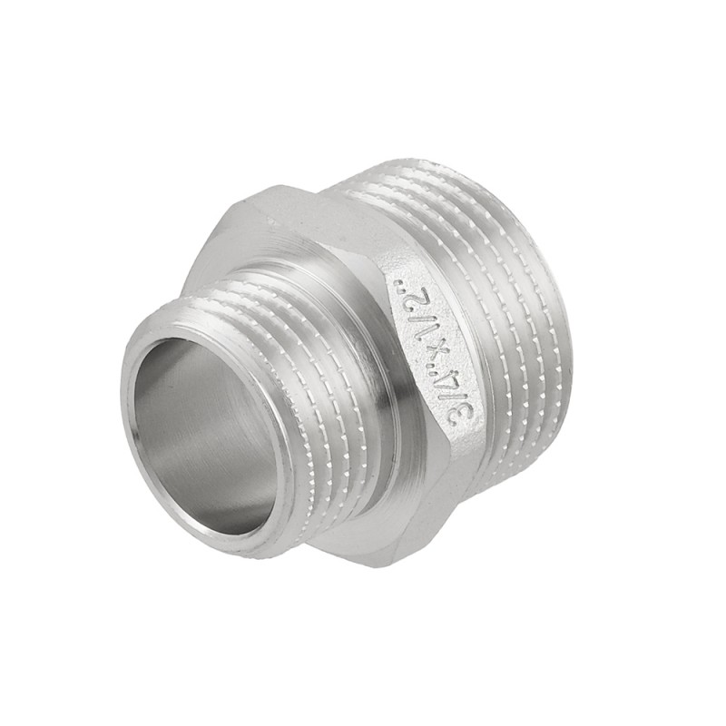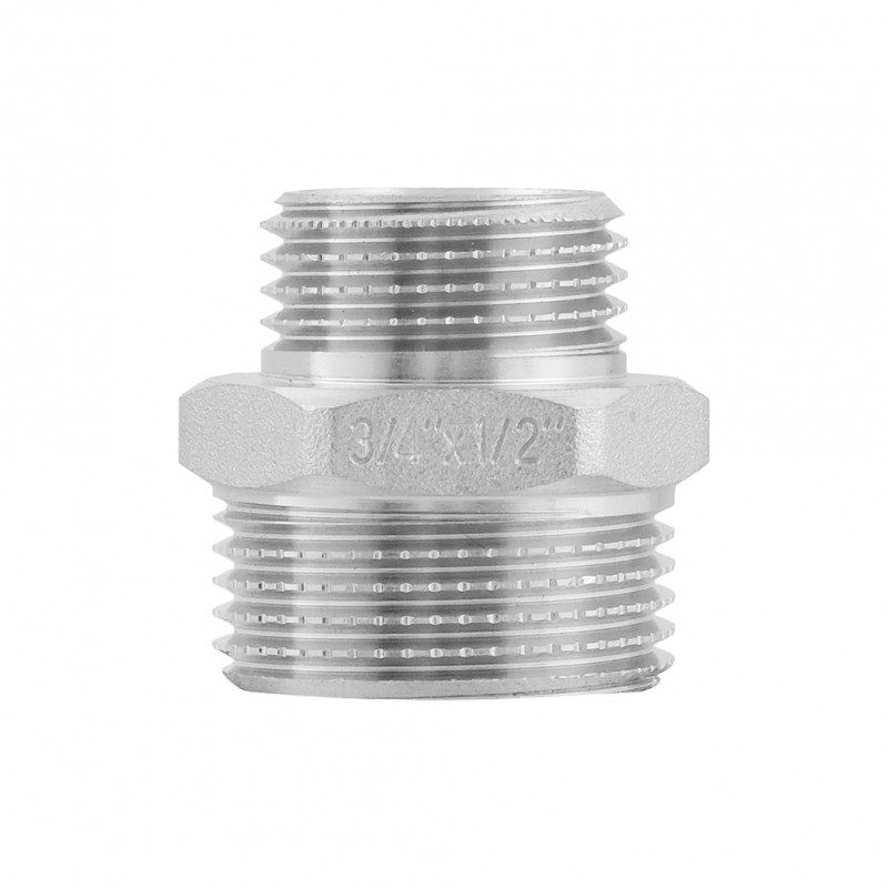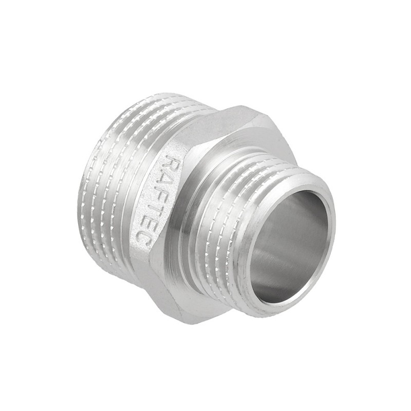 Різьбовий фітинг Raftec - латунний нікельований перехідний ніпель для з'єднання елементів трубопроводу різного діаметру. Різьба зовнішня, циліндрична трубна ISO 228, EN 10226. Корпус шестигранної форми, під гайковий ключ.