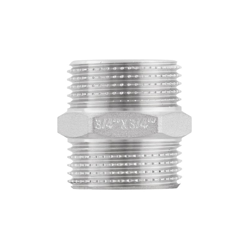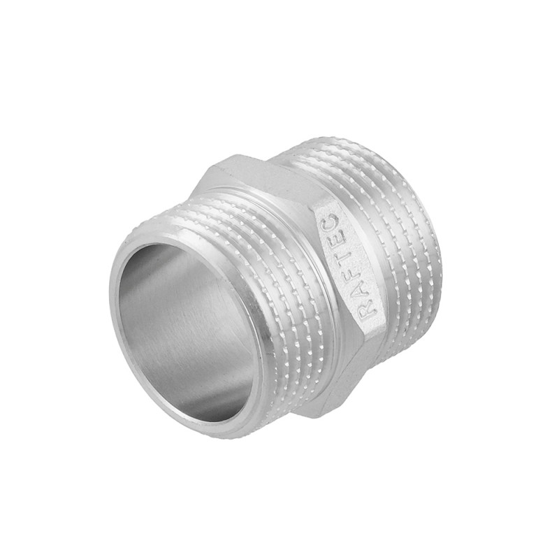 Різьбовий фітинг Raftec - латунний нікельований ніпель для з'єднання елементів трубопроводу рівного діаметру. Різьба рівнопрохідна зовнішня, циліндрична трубна ISO 228, EN 10226. Корпус шестигранної форми, під гайковий ключ.