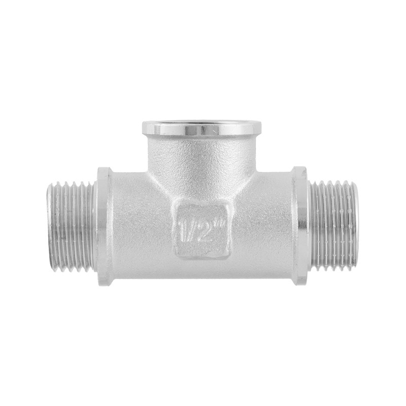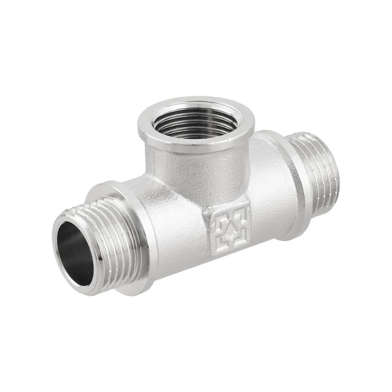 Різьбовий фітинг Raftec - латунний нікельований трьохсторонній фітинг, рівнопрохідний. Різьба зовнішня-внутрішня-зовнішня циліндрична трубна ISO 228, EN 10226.