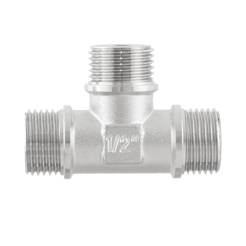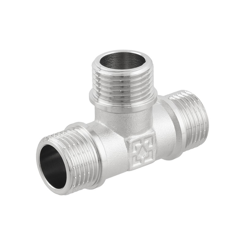 Різьбовий фітинг Raftec - латунний нікельований трьохсторонній фітинг, рівнопрохідний. Різьба зовнішня циліндрична трубна ISO 228, EN 10226.