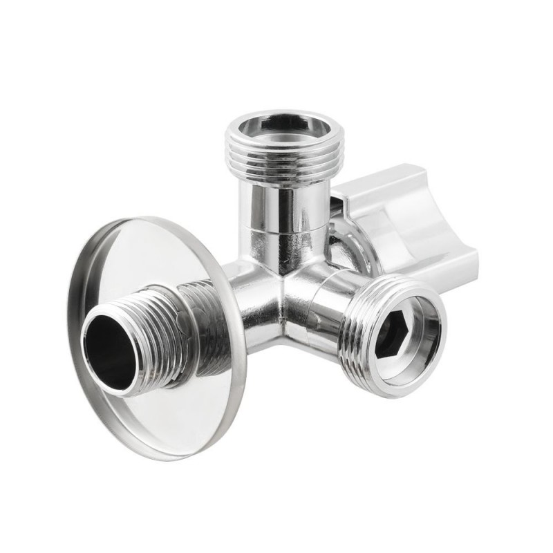 Кран приладовий кутовий Raftec з кульовим чотирьохпозиційним механізмом призначений для підключення сантехнічних приладів — унітазів, пральних і посудомийних машин, бойлерів тощо — до систем гарячого та холодного водопостачання. Корпус виготовлений із латуні марки CW617N методом гарячого штампування та має стійке хромоване покриття, що забезпечує довговічність і захист від корозії. Кран оснащений кульовим запірним елементом із фіксацією у чотирьох робочих положеннях, що дозволяє направляти потік води одночасно на два напрями, подавати його лише на один із виходів або повністю перекривати подачу. Така конструкція гарантує надійну роботу, точне керування потоком та зручність у щоденному використанні. Кран сумісний із гнучкими підводками з накидною гайкою. У комплекті передбачена декоративна чашка.